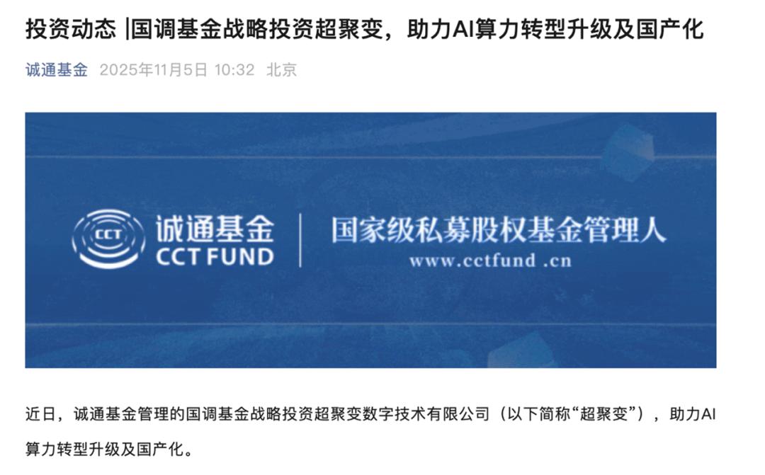 2025年11月5日,由诚通基金管理的国调基金宣布战略入股超聚变。这只由财政部与中央企业共同出资发起、专注于国企结构调整的国家级投资平台,曾深度参与中芯国际、中国铁塔等关键项目,其投资路径长期聚焦制造强国与战略性新兴产业的核心环节。