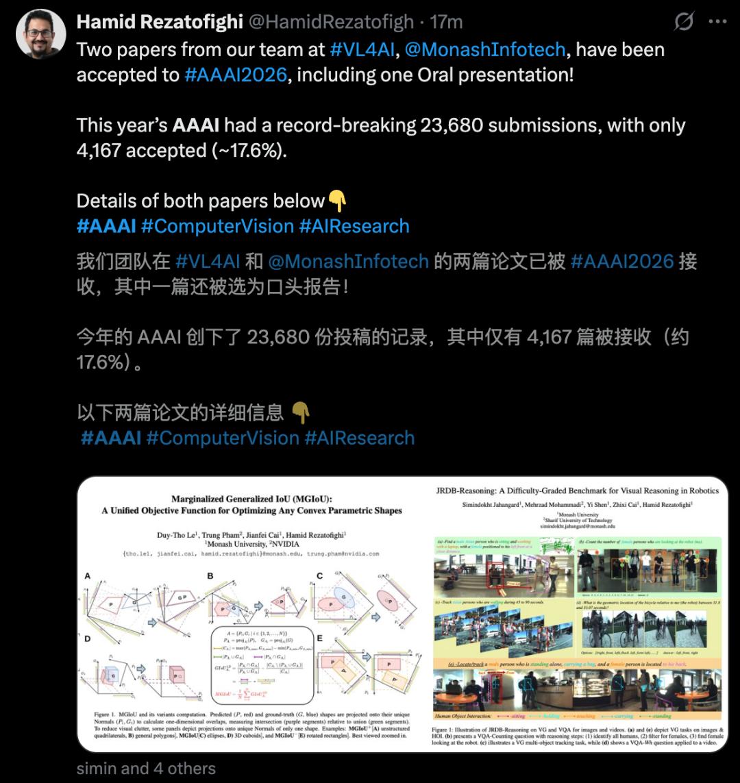 来自蒙纳士大学的副教授Hamid Rezatofighi称,团队也有三篇论文(1 Oral)被录用。