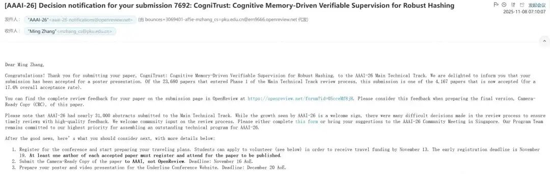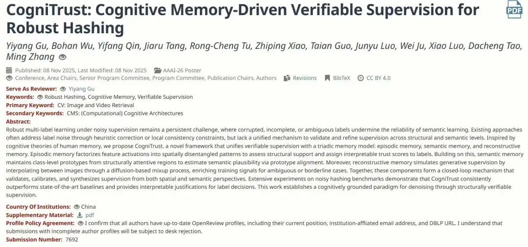 北大张铭教授组中,一位博五同学顾怿洋作为一作的论文被AAAI 2026录用,题为「CogniTrust:基于认知记忆的可验证监督的鲁棒散列方法」。