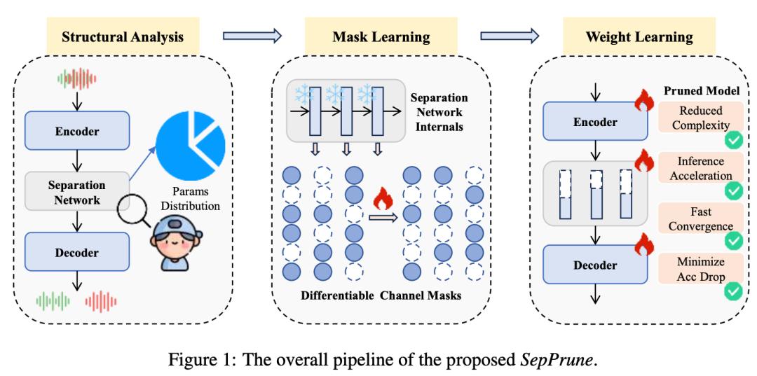 一篇提出了SepPrune,专为深度语音分离模型构建结构化剪枝框架引入创新的「可微分掩码策略」,让模型通过梯度学习自动剔除冗余通道。