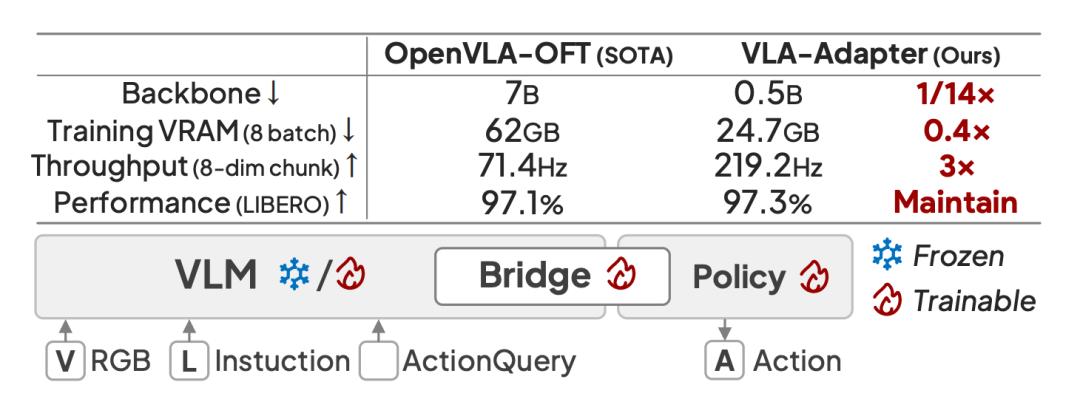 另外一篇,VLA-Adapter作为已经破圈的轻量级VLA基座,在GitHub拿下1.6k个星。它仅需0.5B的小模型就在主流基准上(CALVIN、LIBERO)达到了SOTA性能。两篇工作均完全开源。