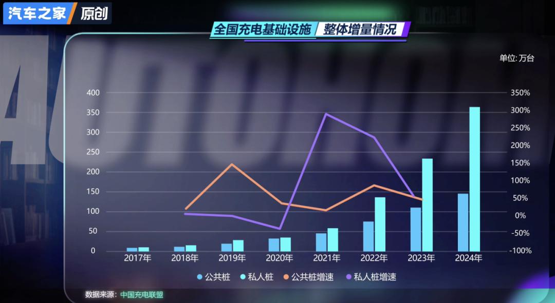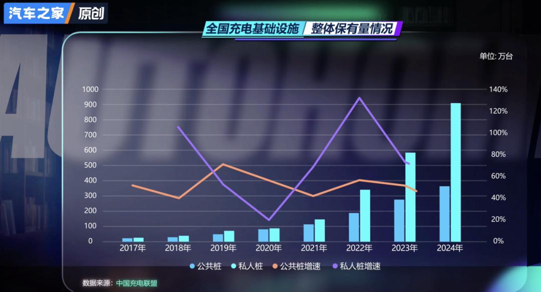 但今年春节,这样的新闻是不是越来越少了?说明情况真的好转了。根据中国充电联盟数据,截至2024年12月底,全国充电基础设施累计数量为 1281.75 万台,同比增长49.11%;2024年全年增量为 422.15 万台,同比增长24.66%,是五年前的8倍多。