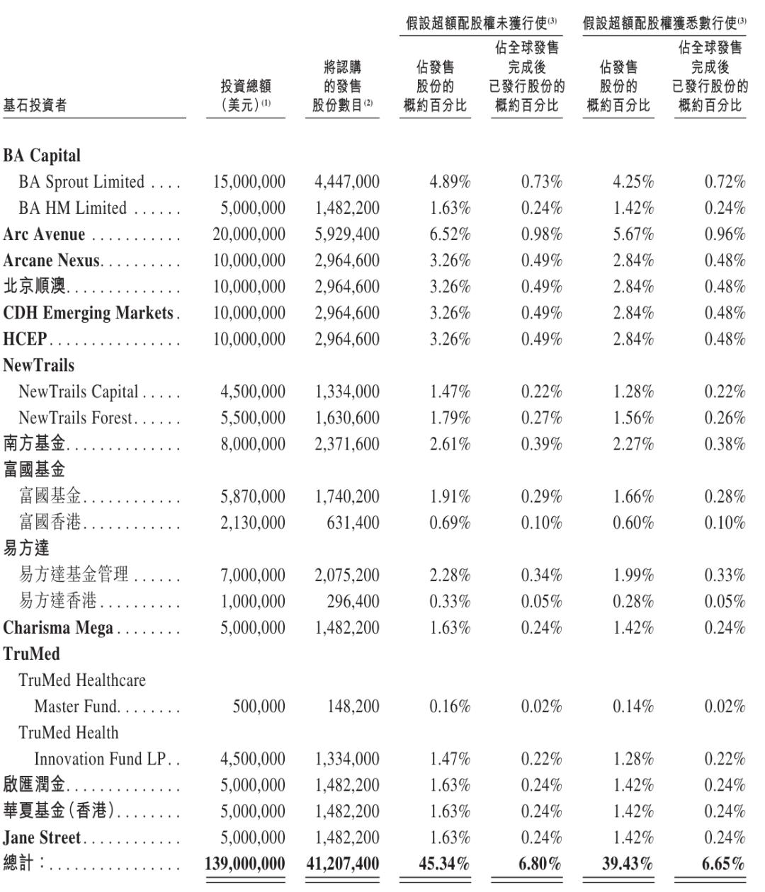 南方基金认购800万美元,富国基金认购587万美元,富国香港认购213万美元,易方达基金管理认购700万美元,易方达香港认购100万美元,Charisma Mega认购500万美元,TruMed Healthcare Master Fun认购50万美元,TruMed Health Innovation Fund认购450万美元,启汇润金、华夏基金(香港)、Jane Street分别认购500万美元。