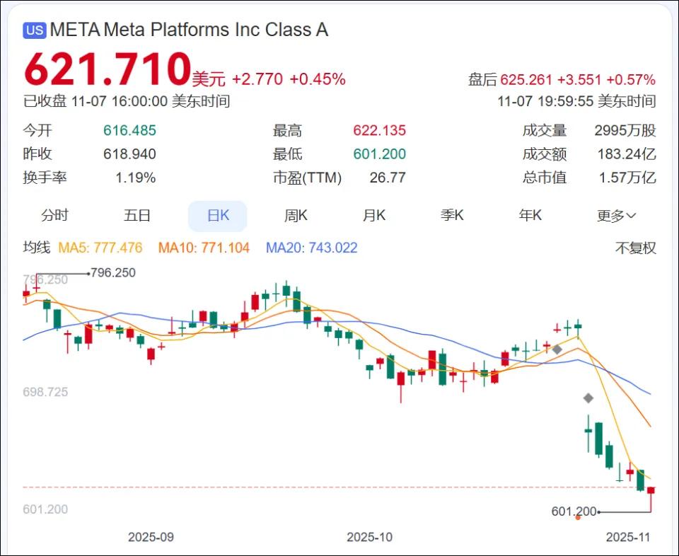 但即使如此,Meta在财报发布当日,股价依旧大跌11.33%,创下三年来最大单日跌幅,市值蒸发2147亿美元。这也是Meta史上第二大单日市值损失,仅次于2022年2月3日。因此,综合来看,这次股价下跌并不意味着Meta的市场信心被完全击穿,相反这更像是一种短期的应激反应。