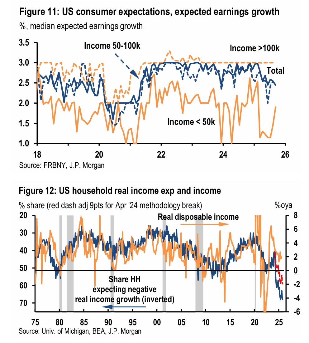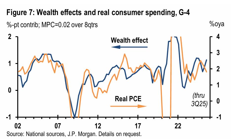 摩根大通的最新研究也指出,目前美国正处在“劳动收入增速放缓、但资产价格推高了家庭财富、消费因而得以维持”的状态。这种维持依赖于资产价格的持续走强,本身稳定性有限。