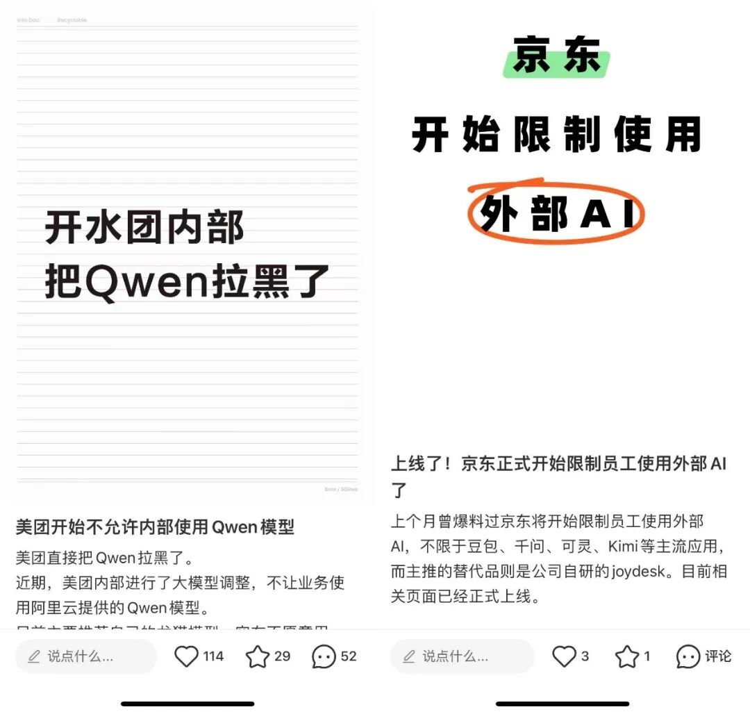 据多家媒体报道,京东从3月底开始正式限制外部AI,员工打开外部网站会有页面拦截,如果想使用外部AI工具,需要特别申请。无独有偶,美团近期也传出“不再推荐业务团队使用阿里云Qwen模型”的消息,要求员工优先使用自研大模型LongCat。