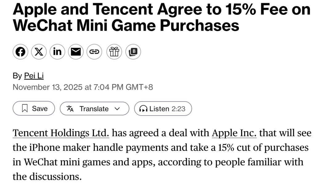 另昨晚彭博社报道,腾讯与苹果达成协议,苹果将可以从微信小程序和小游戏中抽成 15%。小程序合作伙伴计划得以在中国推行,与该协议的关系巨大。