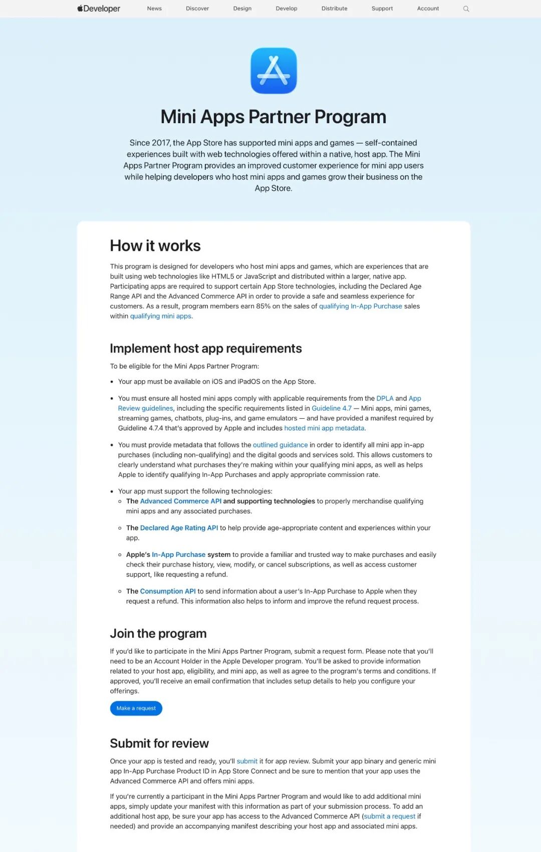 当宿主 App 满足了苹果上述所有要求,它就能加入 Mini Apps Partner Program。而苹果给的回报非常直接: