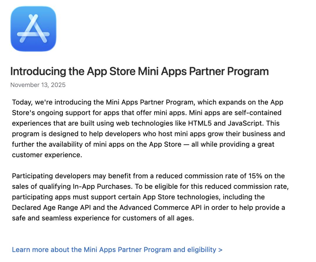 就在刚刚,苹果正式发布了一个可能会改变应用生态的计划——小程序合作伙伴计划(Mini Apps Partner Program),正式宣布为小程序建立制度化的合规框架。