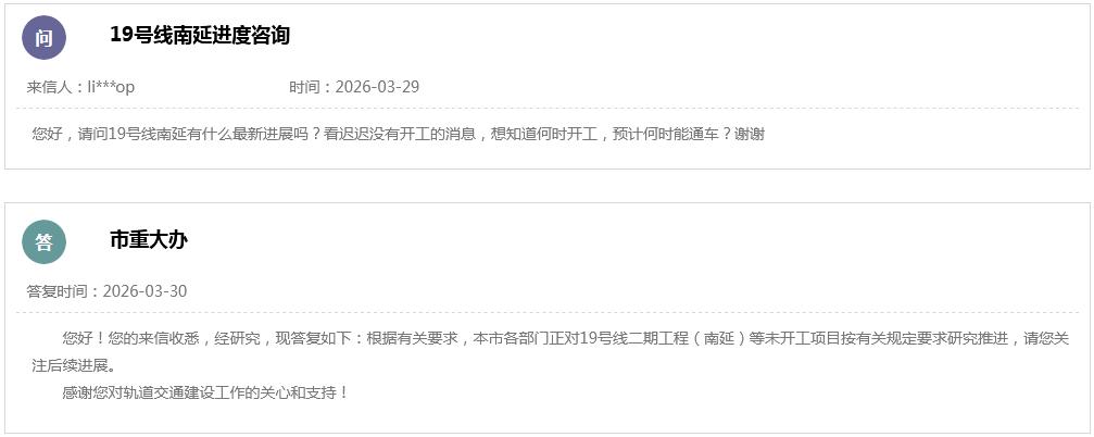 对于市民的咨询,市重大办答复:根据有关要求,本市各部门正对19号线二期工程(南延)等未开工项目按有关规定要求研究推进。