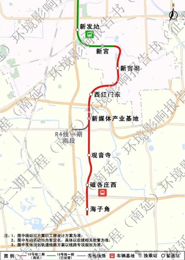 在北京轨道交通三期建设规划中,目前的19号线将分别向北、向南延伸。根据此前公示的一体化规划方案和环评报告,19号线二期南延是南起大兴区的海子角站,北至目前19号线一期的新宫站,全长约12.7公里,全部采用地下线。