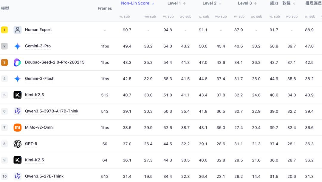 例如,Qwen3.5-122B-A10B-Think(64 frames)在无字幕和有字幕设置下,分别带来+3.8/+5.8的提升。这说明,显式文本语义仍然是很多模型完成多步推理时重要的「锚点」。