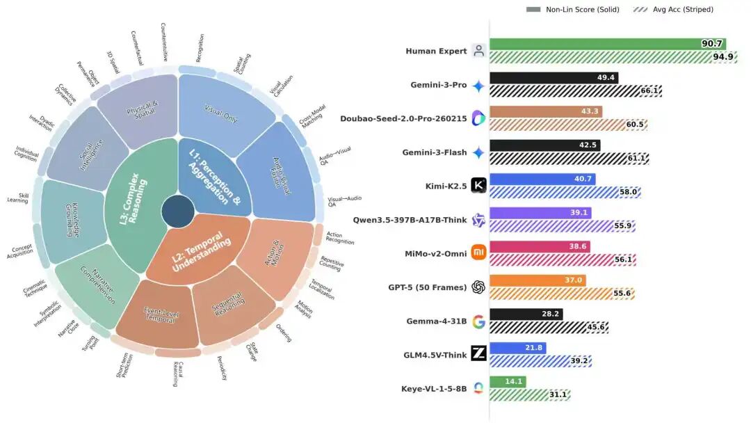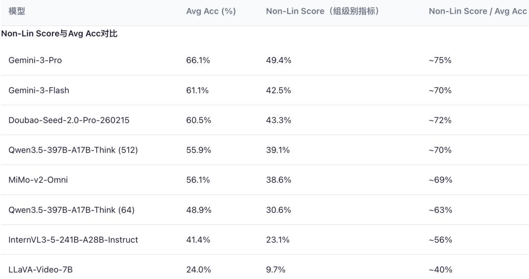 评测结果显示:人类专家的非线性得分为90.7(传统Acc为94.9),而当前最强的商业模型Gemini-3-Pro得分仅为49.4,开源模型Qwen最佳结果为39.1。