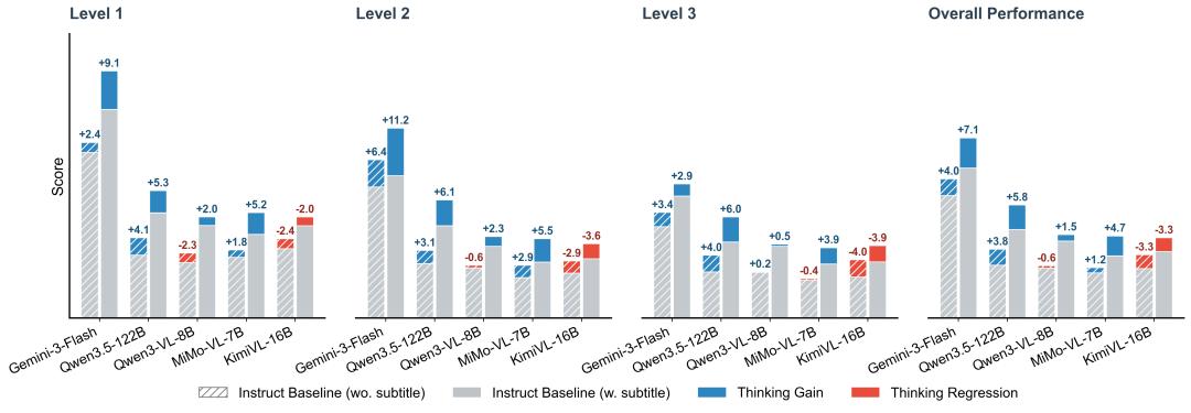 但另一方面,Thinking也可能带来退化。Qwen3-VL-8B在无字幕设定下出现了-0.6的下降,而KimiVL-16B在整体上出现了-3.3/-3.3的性能回落,在更强调复杂推理的Level 3上,退化甚至达到-4.0/-3.9。