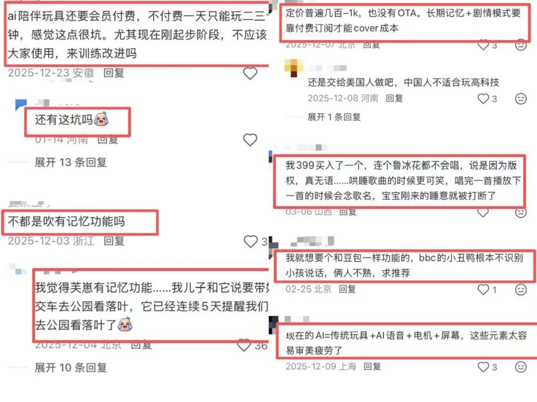 今年春节,王先生花460元在某电商平台买了一个智能玩具给女儿,结果没几天孩子就不喜欢了,“挺贵的东西,除了简单对话、讲故事基本没什么用,掉电快不说,还要买会员才能解锁更多玩法,想退又过了7天无理由,扔在家里闲置了。”王先生一气之下去社媒吐槽,结果发现,对智能玩具表达不满的用户不在少数。