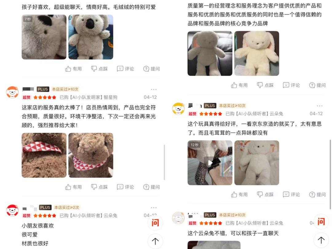 但是,在电商平台上我们也看到用户对京造智能玩具给出了这样的评价,“太会给孩子提供情绪价值了!”“嗲嗲的,好可爱,娃学习一天回家玩一会说好解压。”