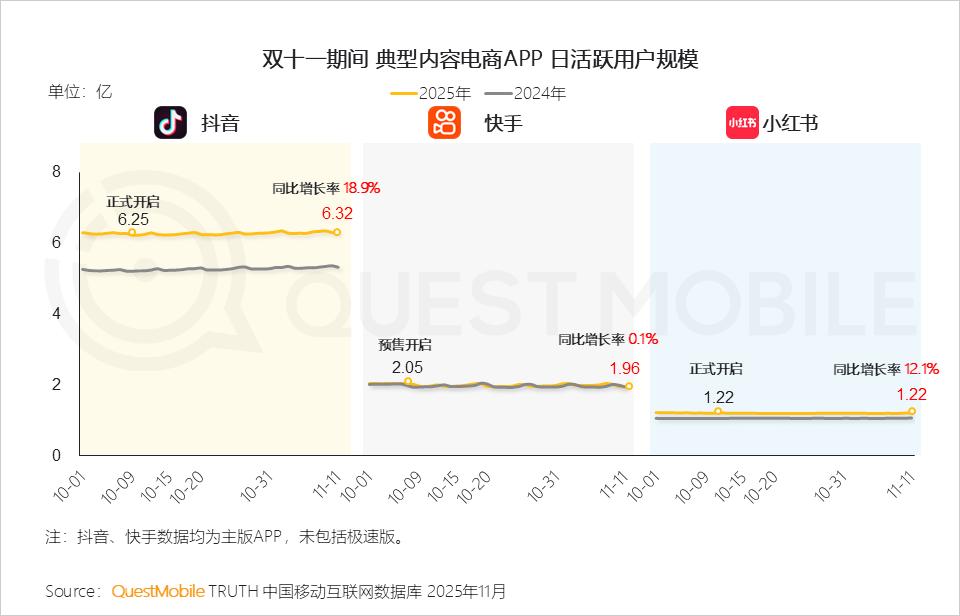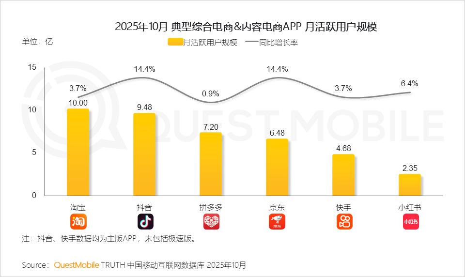 QuestMobile数据显示,2025年10月,淘宝、抖音、拼多多、京东、快手和小红书APP月活跃用户规模同比增速分别为3.7%、14.4%、0.9%、14.4%、3.7%、6.4%,规模分别达到10.00亿、9.48亿、7.20亿、6.48亿、4.68亿、2.35亿。