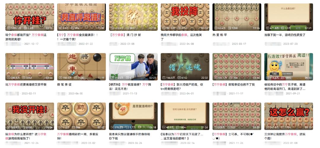 他做了市场调研,觉得象棋虽然没有麻将普及度那么高,但大家多少都知道基础规则,因此有很大潜力。他注意到一款经常因为夸张的「大招版」出圈的手游《万宁象棋》,B站视频常有几百万甚至上千万的播放量,看起来流量很高,受众很广。他觉得,一款玩法机制新颖的象棋游戏,应该也是有市场需求的,类似于最近人气比较高的《我在地府打麻将》和《青天井》。