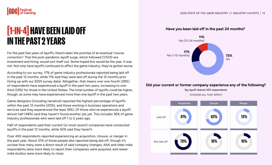 安德鲁的经历绝非个例。GDC今年初发布的《2026年游戏产业状况报告》显示,过去两年内,美国游戏行业有三分之一(33%)的从业者曾被裁员。而在全球被裁员的受访者中,策划岗位以20%的比例居于首位。