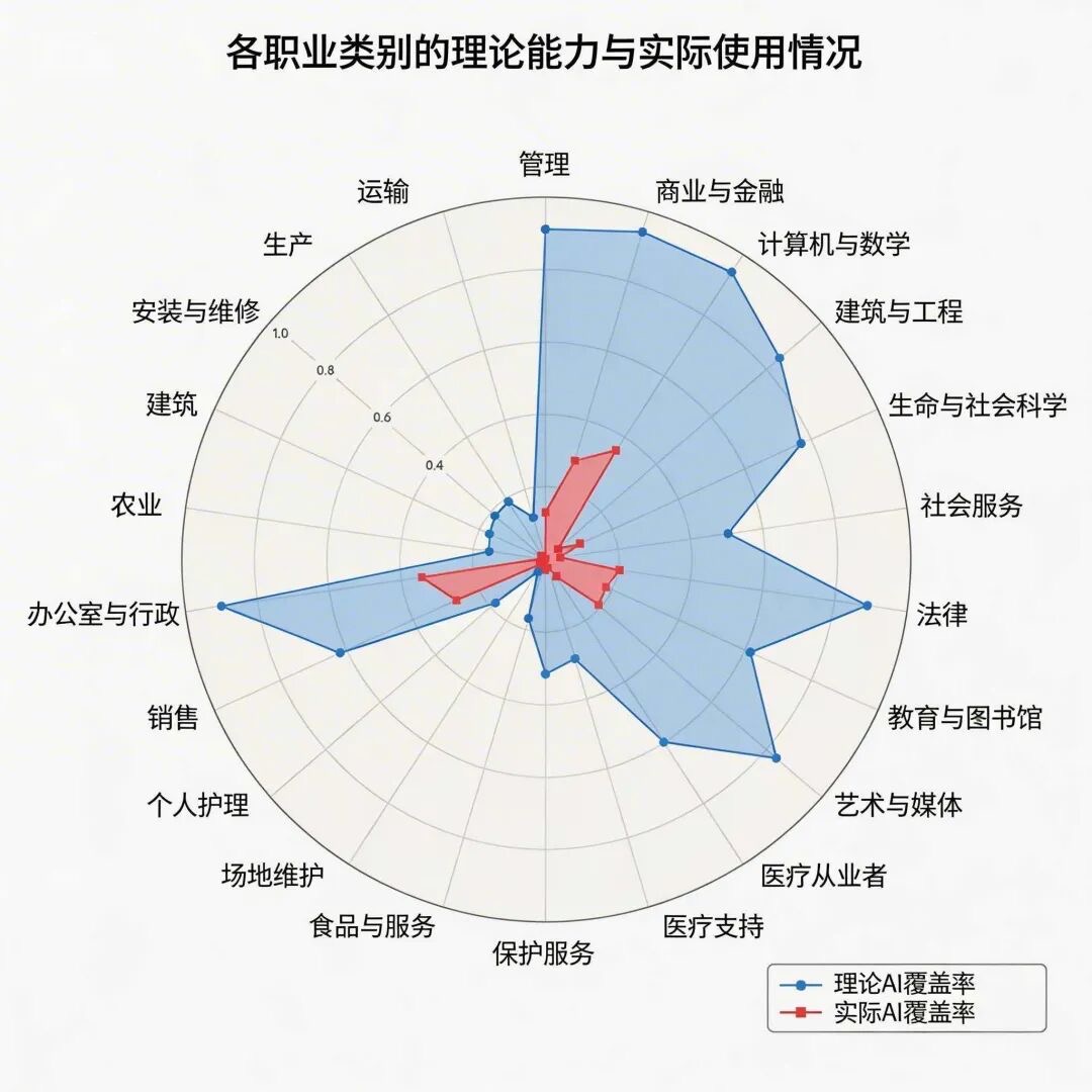 今年3月,Anthropic发布的一份报告显示:商业与金融、计算机与数学、办公室与行政、管理、法律、艺术与媒体是「理论AI覆盖率」最高的六类职业,而目前「实际AI覆盖率最高」的七类职业依次为计算机与数学、办公室与行政、商业与金融、销售、法律、艺术与媒体、教育与图书馆。