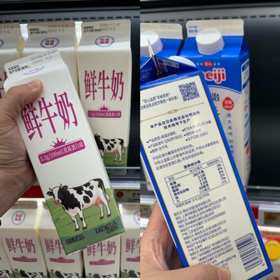 让我困惑的是,明治这一款蛋白质含量只不过多了0.2克,差价却高达22元。凭啥?是明治的牛生活得更精致,是外资品牌要收关税,还是某种秘而不宣的阶层溢价?