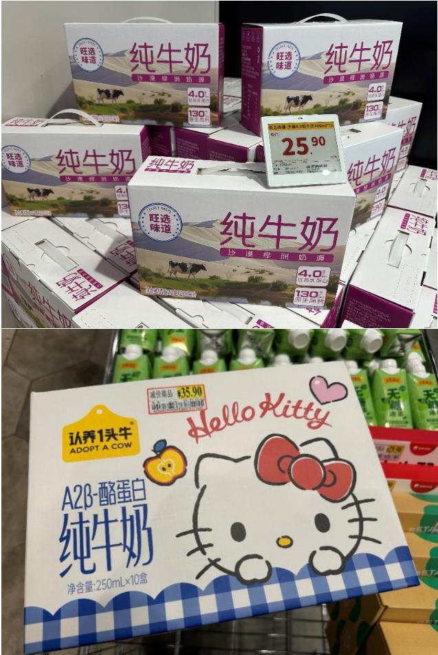 永旺自家的“沙漠4.0”纯牛奶,一箱200ml×12盒,卖25.9元;而旁边的"认养1头牛&HelloKitty"联名款,一箱10盒,卖35.9元。我随手翻了翻后者的箱底,生产日期标的是“2025年11月”。按180天的保质期计算,这批奶再过一个月就要到期了。在保质期的生死线上挣扎,价格却比超市自有品牌贵10块钱。