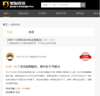 “认养1头牛”走的则是另一条路。尽管它在2025年营收突破70亿元,但关于牛奶变质的投诉也不时出现。截至4月9日,在黑猫投诉平台上,以“认养1头牛”为关键词的投诉为1116条,涉及发过期奶、产品变质结块、内含异物等。