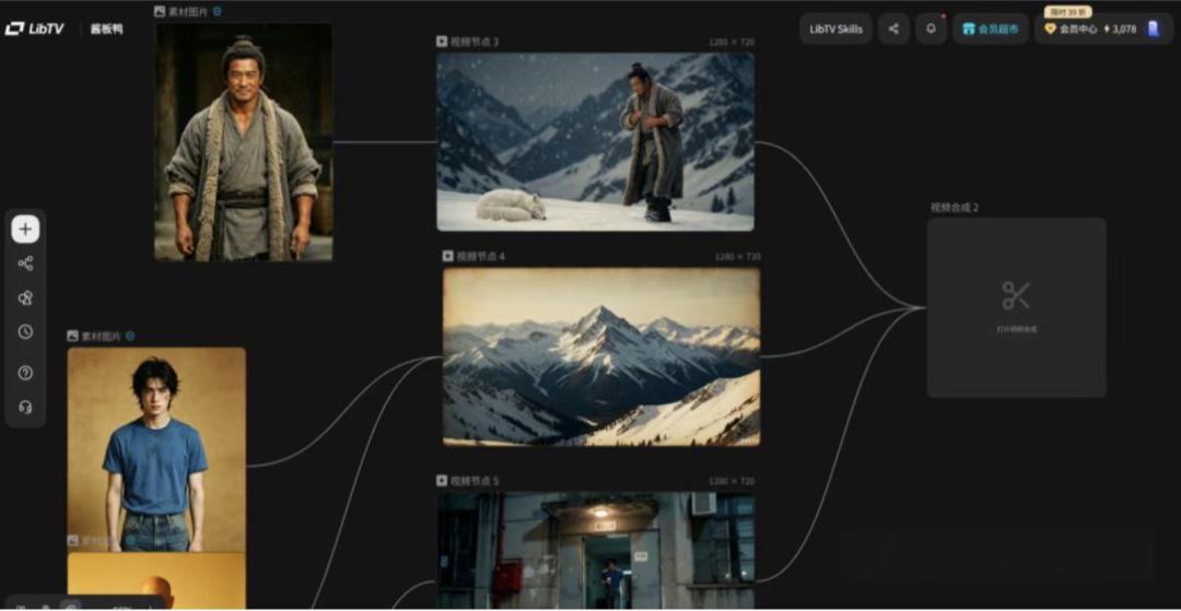 首先,从单一生成工具转向全流程集成平台,整合脚本、素材、分镜、生成、后期等环节,减少工具切换成本——LibTV以节点式画布为核心,将图片增强、视频后期、灯光控制、多机位切分整合在同一创作环境;Seko则打通了从多集剧情规划、分镜生成到配音配乐的完整链路,最多支持100集的连续直出。