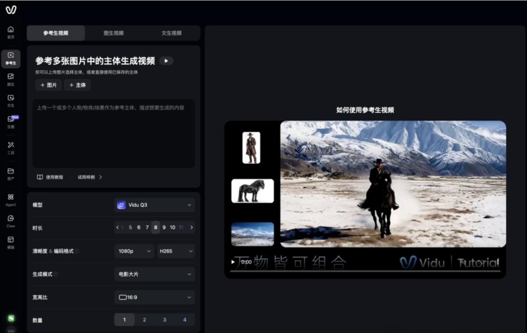 其次,强化内容生产的稳定性与可控性,重点解决角色一致性、场景连贯等核心痛点——Vidu Q3的“参考生视频”将人物、场景、服装固化为可复用资产,实现跨镜头的稳定复现;Seko的多集生成同样以主角形象不漂移、剧情保持连贯作为基础指标。