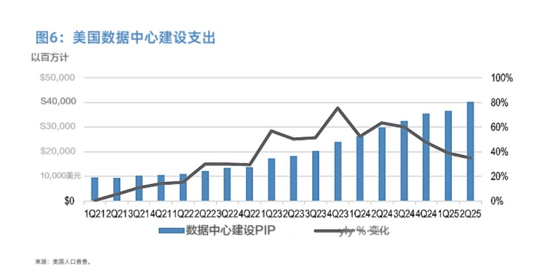 美国人口普查局已经将“数据中心支出”独立统计。从最新数据看,数据中心仍在推动美国的非住宅建筑投资。尽管当前支出规模不算最大,但在整个非住宅建筑里占比已达6%,未来仍有巨大空间。
