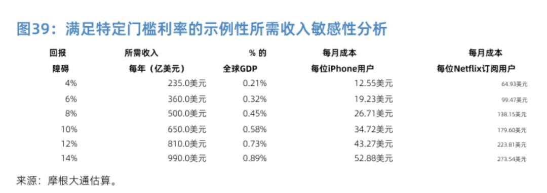 如果要实现10%的合理投资回报率,未来每年AI行业可能需要创造约6500亿美元收入,相当于全球GDP的近0.6%。