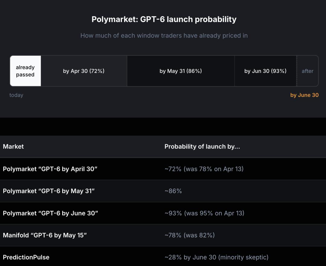 预测市场对GPT-5.5在6月30日前发布给出了超过90%的概率。