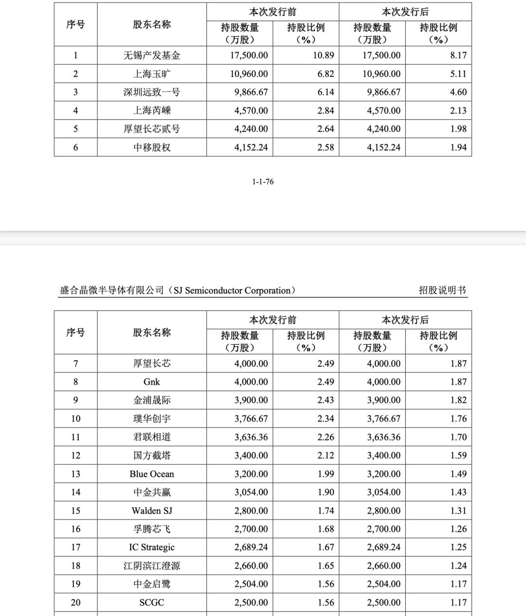 IPO前,盛合晶微无控股股东且无实际控制人,其第一大股东无锡产发基金持股比例为10.89%;第二大股东招银系股东合计持股9.96%;第三大股东厚望系合计持股6.76%;第四大股东深圳远致一号持股6.14%;第五大股东中金系股东合计持股5.33%。IPO后,上述前五大股东分别持股8.17%、6.46%、5.08%、4.60%、4.11%。