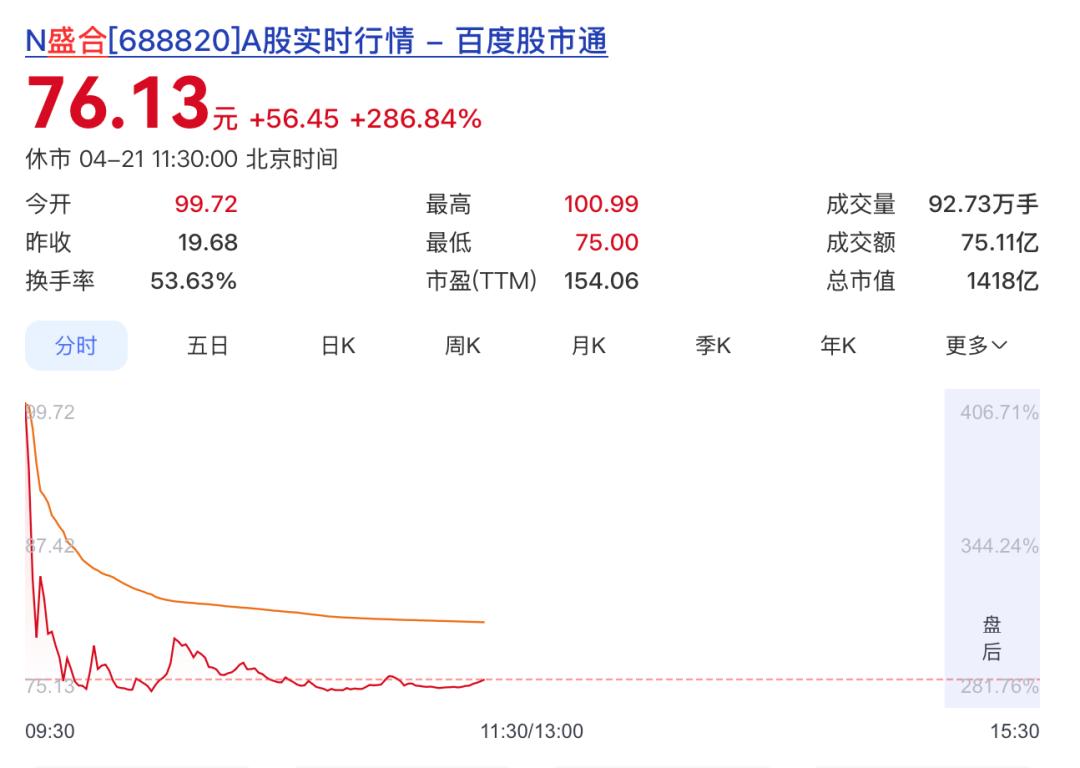 上市首日,盛合晶微开盘大涨406.71%报99.72元,对应市值约1857.55亿元。截至午间休市,盛合晶微涨286.84%报76.13元,总市值1418.13亿元,盘中最高触及100.99元。