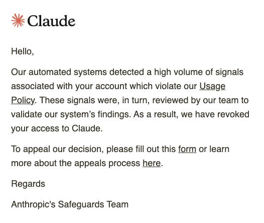 没有预警,没有解释,只收到 Anthropic 发来的一封冷冰冰的邮件:「检测到违反使用政策的自动化信号,您的账号已被暂停」。
