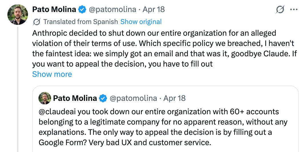 他们 CTO 发了条帖子对 Anthropic 说:「你们毫无理由地封禁了我们整个组织的 60 多个账号,没有任何解释。唯一的申诉方式是填一个Google表单?这是什么客户服务?」。