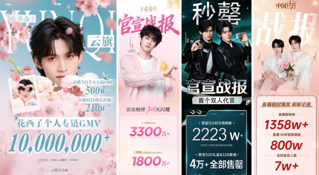 品牌官方数据显示,云旗代言花西子,直播当日个人专链GMV达500万元,官宣日加直播日累计突破1000万元;田栩宁代言半亩花田,官宣后24小时销售额超3300万元。