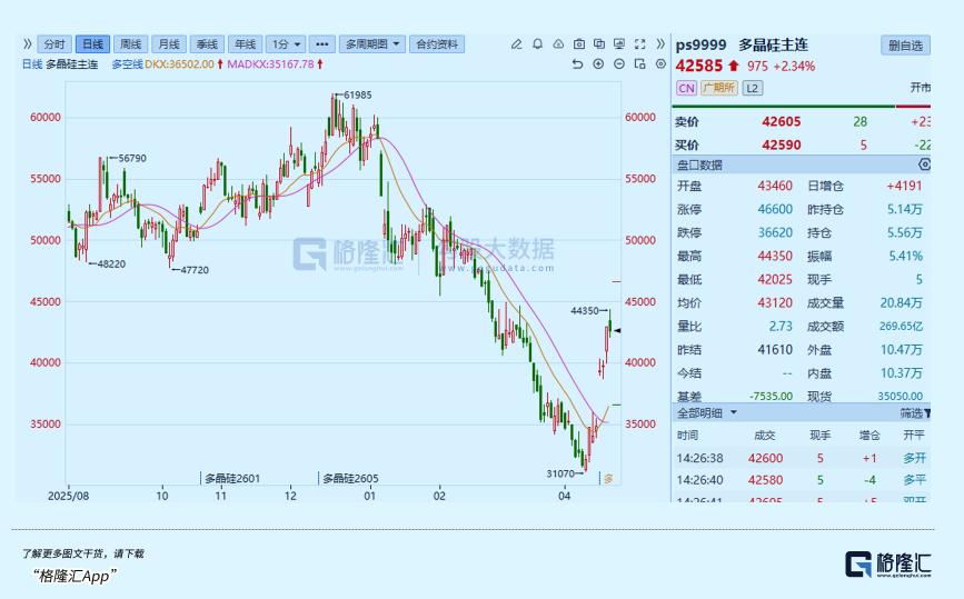 就在上周,市场多次传出有关多晶硅“控产挺价”的小作文,持续刺激资金入场炒作。多晶硅期货主力合约也从4月10日3.1万元/吨的阶段性低点,一路猛涨至超4.4万元/吨,短短几个交易日涨幅超45%。