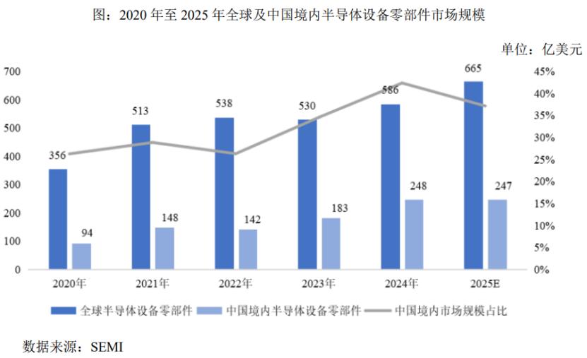 2024年全球及中国境内半导体设备零部件市场规模分别为586亿美元、248亿美元,预计2025年的规模为665亿美元、247亿美元。随国内半导体市场的快速发展及国产替代的整体趋势,国产金属零部件市场份额有望保持增长态势。