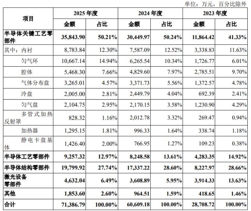 具体来看,2023年、2024年、2025年(简称“报告期”),托伦斯40%以上的营收来自半导体关键工艺零部件业务,半导体结构零部件、半导体工艺零部件的营收占比分别在13%、28%左右,激光设备零部件的营收占比较低且呈下滑趋势。