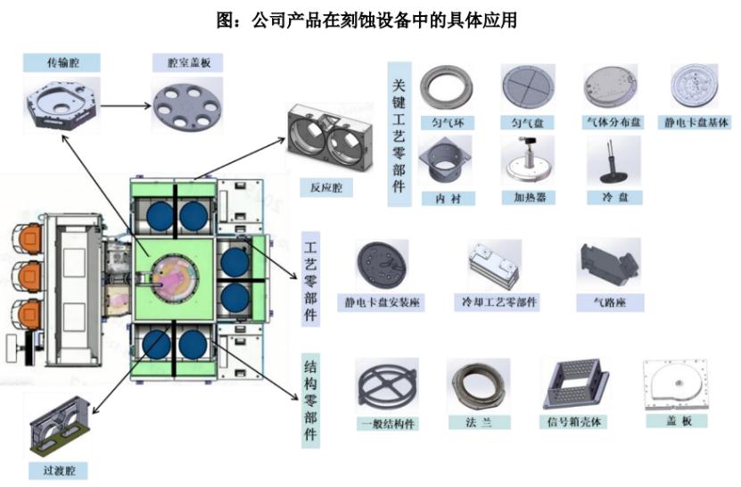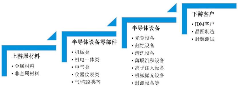 半导体设备零部件行业处于半导体产业链的中上游。上游涉及石墨、硅、铝等原材料开采及加工,下游直接客户为光刻设备、刻蚀设备、清洗设备等半导体设备生产商。