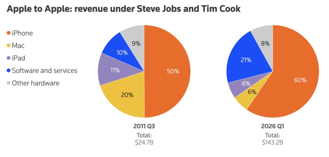 2011年和2026年,史蒂夫·乔布斯与蒂姆·库克治下苹果的营收