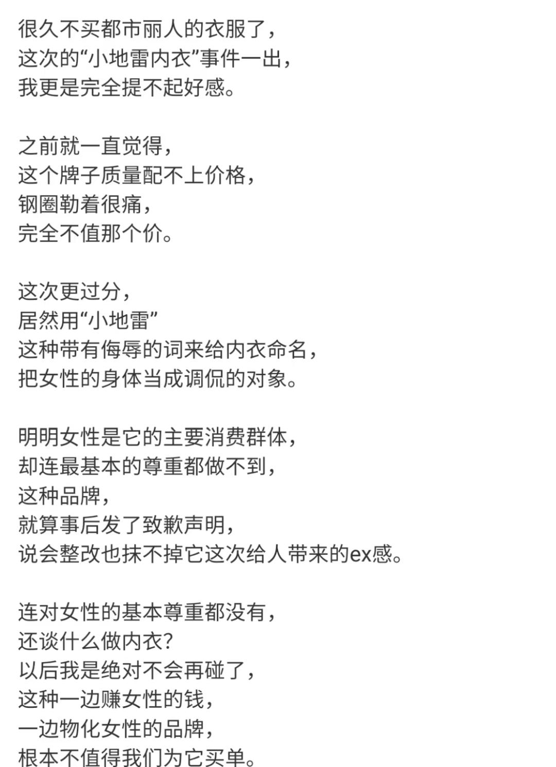 声明中坦然承认“小地雷”一词存在侮辱女性、擦边低俗的问题,更明确表态,凡是冠以“都市丽人”品牌标签的产品,一切责任均由品牌自身承担,绝不推卸。