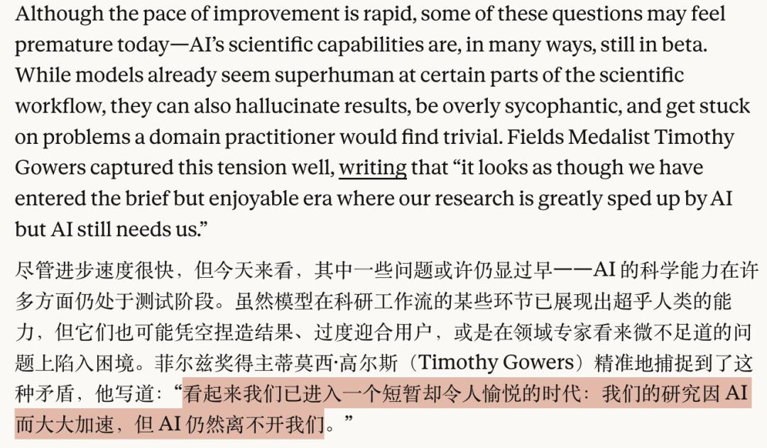 我们似乎进入了一个短暂但令人愉快的时代,AI大大加速了我们的研究,但AI仍然需要我们。