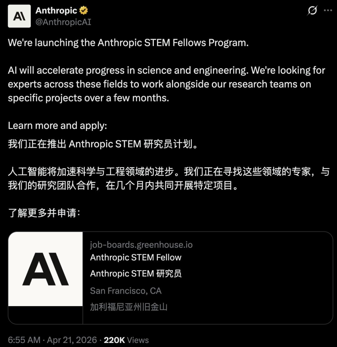 现在回头看Anthropic STEM Fellow的岗位描述,一切都说得通了: