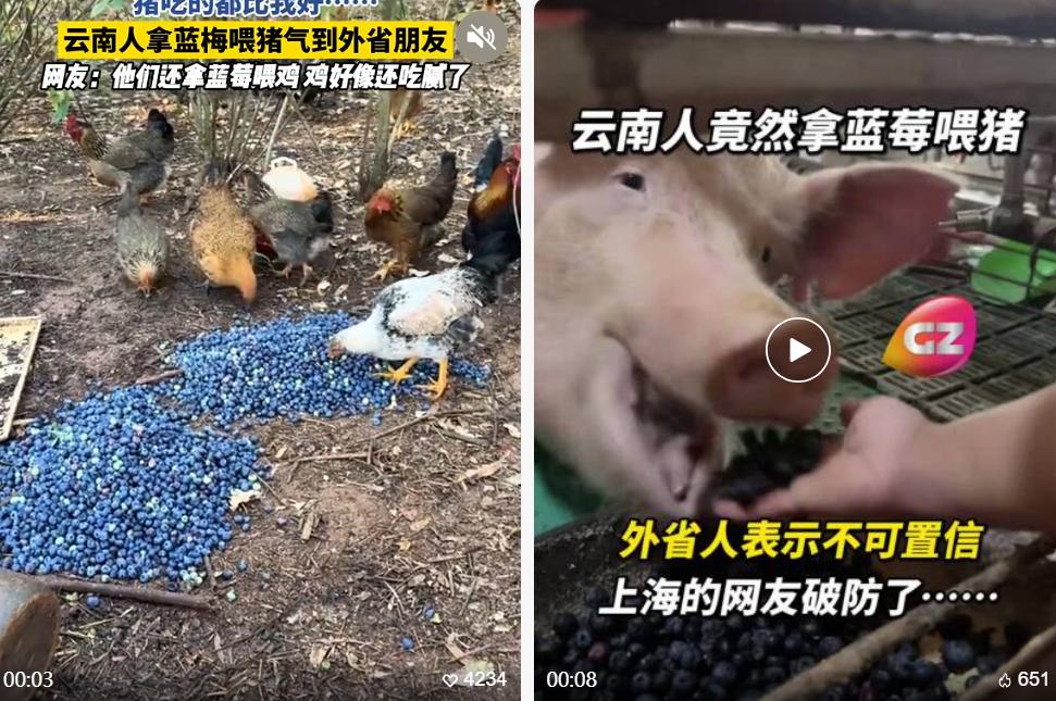 但现在,不仅有些人把自己吃成了阿凡达,连云南一小部分的猪、羊、鸡也快吃吐了,就差开口求主人做个合格的养殖户,多往蓝莓里掺点饲料吧。