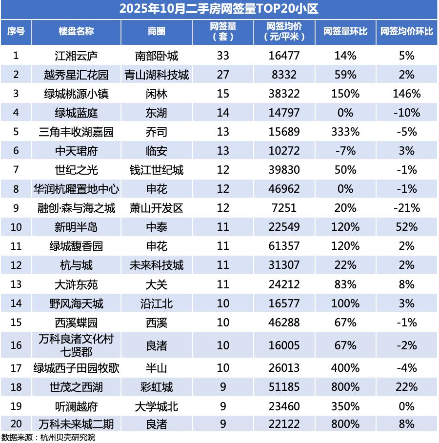 所以,像田园牧歌、悦虹湾、瑷颐湾等盘,一个月成交10套上下,都能排进前20。若是回到月成交破万套的3月,星瓒颂锦府、杭与城、杨柳郡等热门次新房,一个月能卖四五十套的,这些冷门次新房,压根不会被关注到。