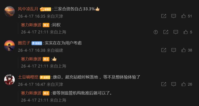 4月17日,逸安启宣布赛力斯作为新投资方加入公司,与宝马、梅赛德斯-奔驰持股比例相等,三家股东将各自持有该合资公司33.3%的股份。通过此次股权投资,赛力斯集团旗下豪华品牌问界,将支持逸安启豪华超充基础设施建设。随着新股东的加入,逸安启将继续通过先进技术与数字化服务,提供豪华充电体验,并为宝马、问界和梅赛德斯-奔驰的客户打造专属尊享充电体验。