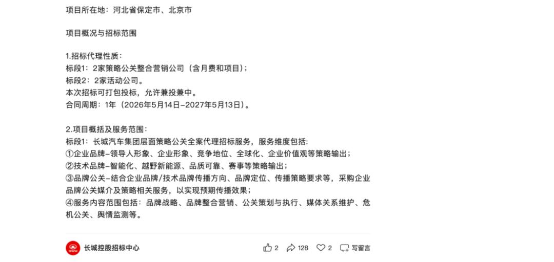根据长城控股招标中心1月公告,长城集团已经为2026年公开招标有成熟经验的整合营销公司和活动公司,服务范围涵盖品牌战略、整合营销再到舆情公关维护等。