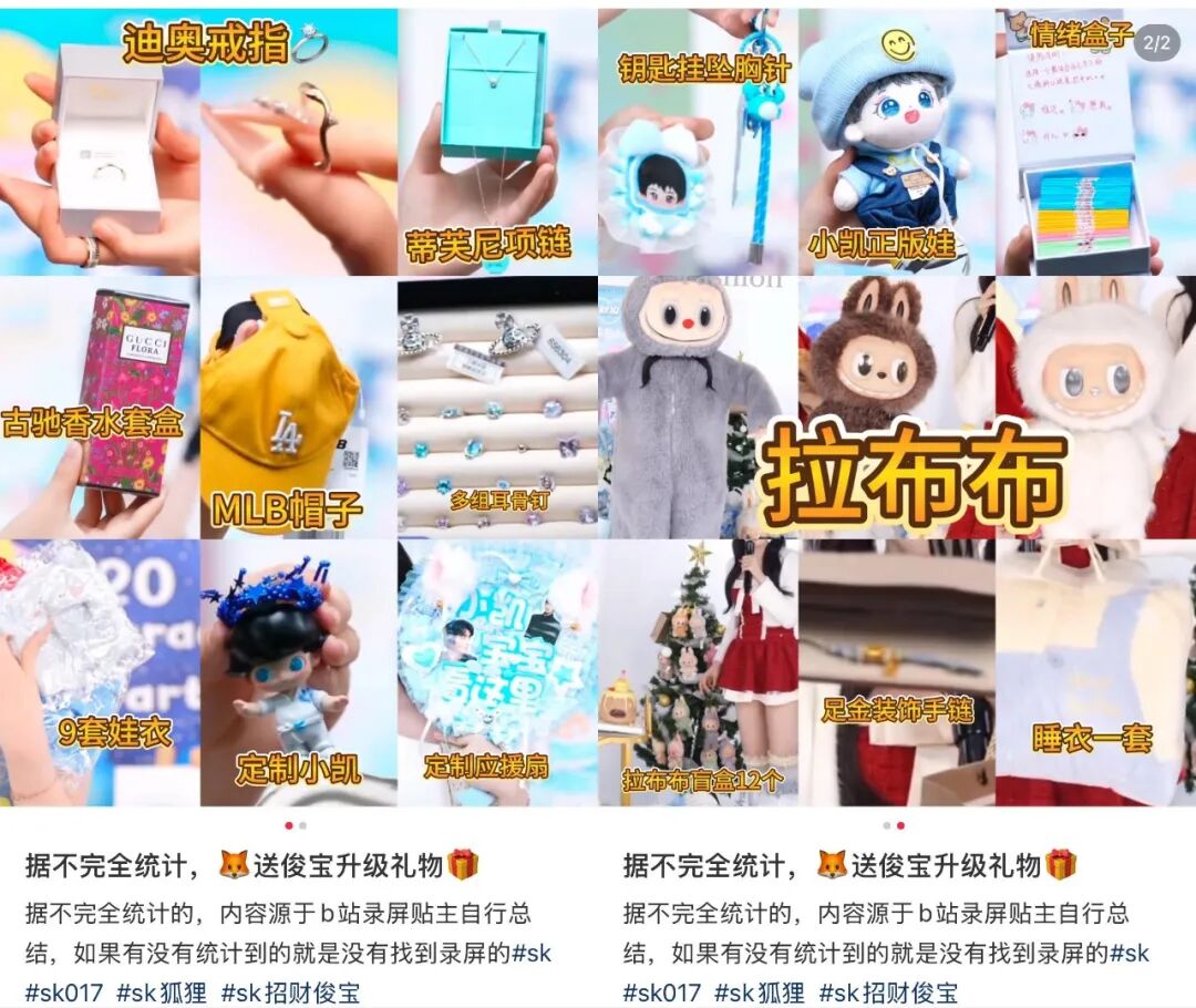 网友估算,1700万中,除去其余主播打赏400万和拆卡直播间(网友购买小卡盲袋,主播现场拆盒)消费600万元,仅SK狐狸一人的打赏就占了700万。这700万打赏中,扣除相关方抽成后,狐狸实际到手金额在100-140万上下。为了投桃报李,狐狸在特殊日子也给“招财俊宝”送过迪奥戒指、GUCCI香水、蒂芙尼项链等礼物。